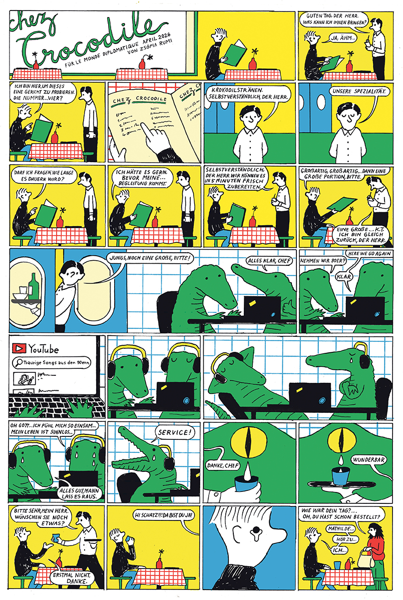 Das Thema spukte Zsófia Rumi schon länger im Kopf herum: Krokodilstränen als Delikatesse. Frei nach dem Spruch „Liebe geht durch den Magen“ geht in ihrem Comic ein ordentlicher Schluck Krokodilstränen direkt durchs Auge des Gourmets. Kein Wunder, dass der nicht nur seinen gastronomischen Genuss im Blick hat ... Kaum hatte Rumi ihre Zeichnung für Le Monde diplomatique fertiggestellt, stellte sie sich neue Fragen zum Thema: Welchen Song hören die Krokodile, um möglichst ergiebig zu weinen? Wie schmecken ihre Tränen? Und werden sie für ihre Leistung auch gut genug bezahlt?