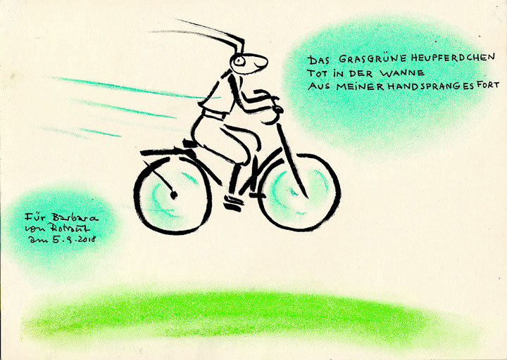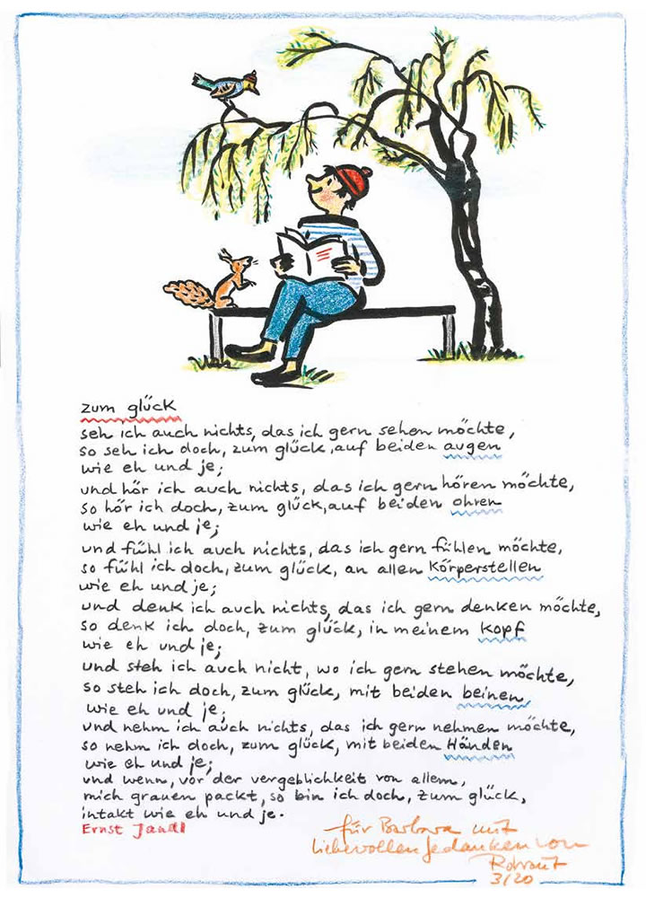 Barbara Bauer, geborene Schulz, Tochter eines in der Forschung tätigen Physikers, interessierte sich für Fakten und war Romanistin ihrer Ausbildung nach, also mit dem Handwerk der Philologie vertraut, mit Worten wie Sätzen ihr bewusstes Leben lang befasst. Noch die Wahrnehmung der politischen Gegenwarten war geprägt von ihrem Sinn für Formfragen und der Bedeutung, die Barbara ihnen zumaß. Da sie sich wie jede gute Redakteurin mit der Abklärung von Sachverhalten und der Formfindung beschäftigte, teilte sie mit ihrer langjährigen Freundin Rotraut Susanne Berner eine, bei Barbara in der Regel eher verstohlen gepflegte, Passion für die Poesie, zumal die zeitgenössische Lyrik. Ihre bevorzugte Ferienlektüre waren Lyrik-Anthologien, aus denen sie mir die für sie bedeutsamen Fundstücke gerne vorlas.Während ihrer Arbeit für den Verlag Luchterhand, der das Werk des österreichischen Dichters publiziert hat, stellte sich ein Kontakt zu Ernst Jandl her. Ihn betreute Barbara auf seinen gelegentlichen Lesereisen durch Deutschland – Unternehmungen, während derer sie ihr Organisationsgeschick unter Beweis stellen musste, weil Jandl ein nervöser Reisender war. So haben die beiden viele Stunden auf Bahnsteigen miteinander verbracht, weil Jandl die Züge nicht verpassen wollte. Er bestand darauf, möglichst frühzeitig vom Hotel abgeholt zu werden, um etwaig auftretenden Komplikationen begegnen zu können. Diese Art, unterwegs zu sein, bezeichnete Barbara fortan als „jandeln“. Wir kannten einige Leute, die jandelten, und zu Barbaras gelegentlich etwas befremdetem Amüsement gehörte auch ich, ihr Ehemann, dazu.Als nach ihrer Krebsdiagnose feststand, dass Barbaras Tage auf Erden rasch gezählt sein könnten, begann Rotraut damit, ihr lyrische Kassiber in ein Dasein zu schicken, das ausgesprochen fragil geworden war. Eines dieser Blätter gibt das oben abgedruckte Faksimile wieder. Die noch aus den formativen Jahren der taz, von Klaus Wagenbach stammende Forderung, die Zeitung solle jeden Tag ein Gedicht abdrucken, fand sofort Barbaras Zustimmung. Martin Bauer